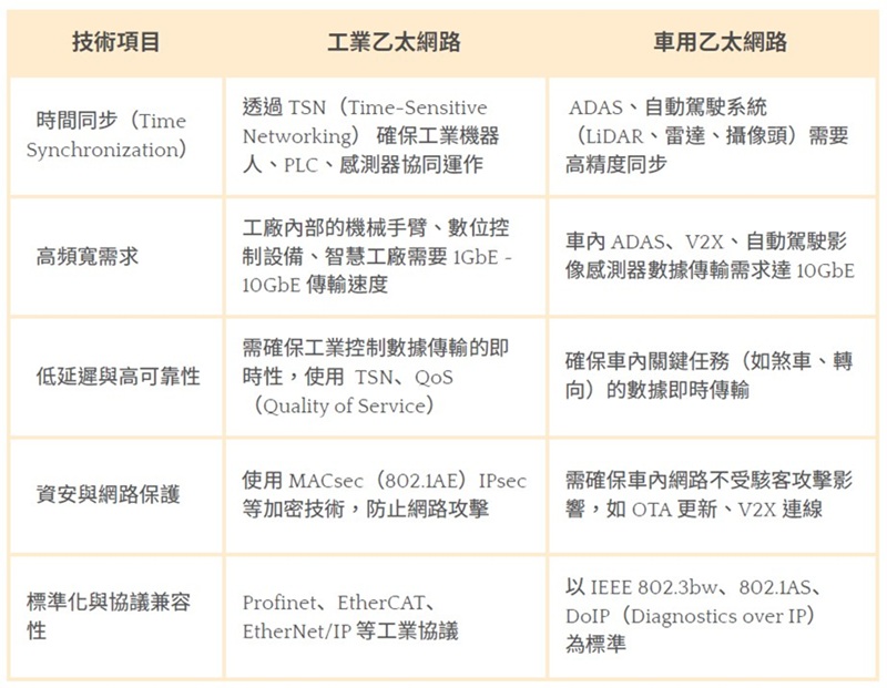 工業(yè)乙太網(wǎng)路( Industrial Ethernet ) 與車用乙太網(wǎng)路( Automotive Ethernet)雖然應(yīng)?領(lǐng)域不同,但兩者在高可靠性、低延遲、資安防護(hù)、與標(biāo)準(zhǔn)化協(xié)議方面有許多相似性,因此部分技術(shù)、設(shè)備與發(fā)展方向可以互相應(yīng)用或轉(zhuǎn)移。以下是具體的對(duì)應(yīng)關(guān)係: