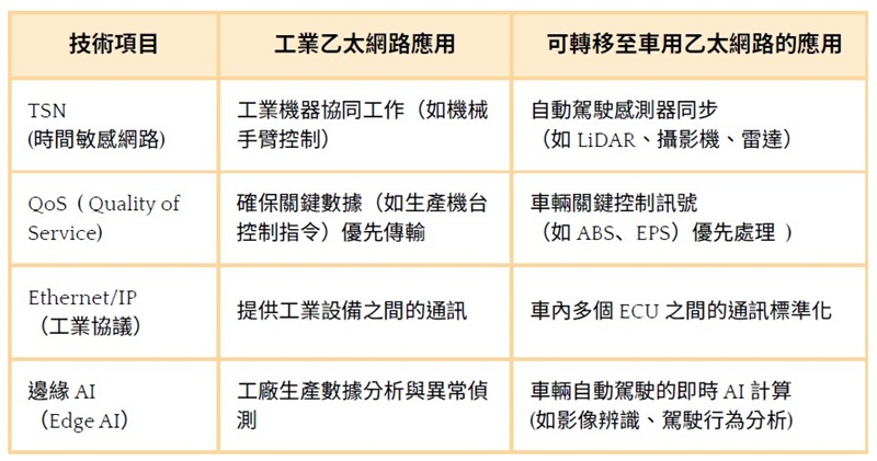 工業(yè)乙太網(wǎng)路與車用乙太網(wǎng)路雖然應(yīng)用場(chǎng)景不同,但高可靠性、低延遲、資安防護(hù)、標(biāo)準(zhǔn)化協(xié)議 使兩者有許多技術(shù)可以互相轉(zhuǎn)移與應(yīng)用,包括: