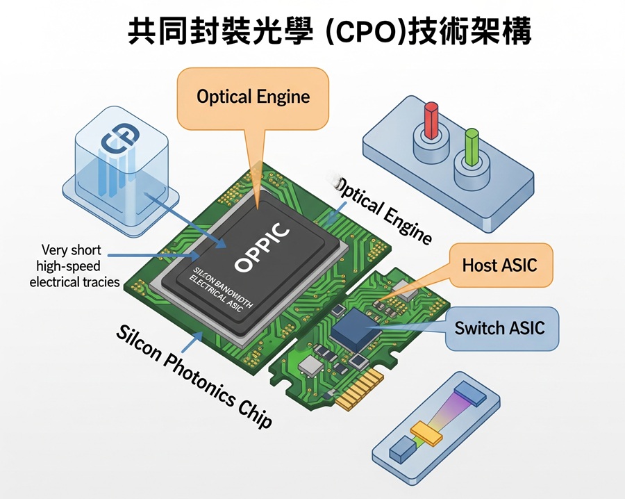 圖四 : CPO架構提出了一個解決方案,將光學收發引擎(包含雷射、調變器、探測器等)與交換器ASIC等電子晶片共同整合在同一個封裝基板上。