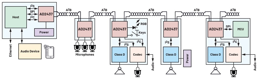 A2B是一種雙向高頻寬數位音訊匯流排,能夠在很長的距離上(節點間的距離長達30公尺,整個匯流排長度為300公尺)使用一條2線式非遮罩雙絞線(UTP)電纜傳輸I2S/TDM/PDM資料、I2C/SPI控制資訊,以及時脈和供電訊號。該匯流排在汽車應用和統一通訊應用中已經非常成熟,而透過不斷的深入開發,A2B還可用於許多商業和工業用途。
