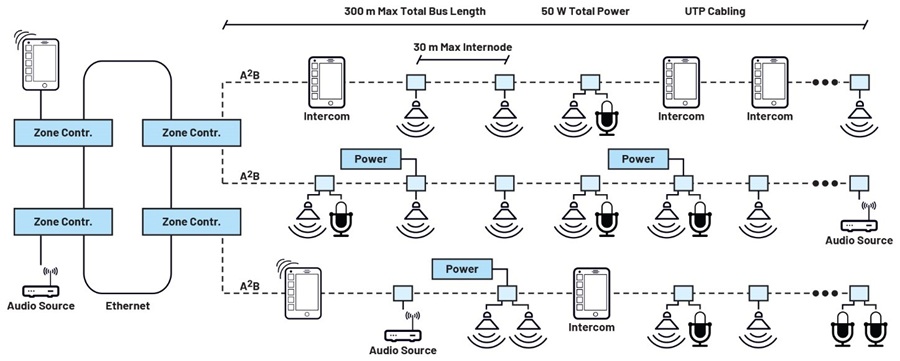 此外,音樂播放分配、語音警報、廣播和對講功能可以成為該系統的一部分,系統的複雜性因而會增加。隨著系統不斷發展,以及對額外廣播功能的需求不斷增加,相關系統設計變得越來越複雜,而A2B技術可能有助於滿足此一需求。