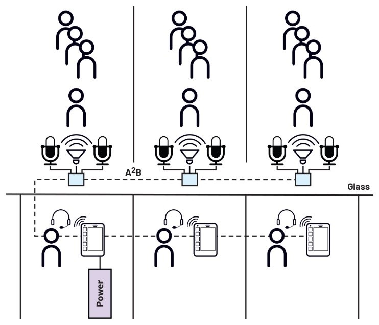 A2B匯流排的超低延遲和完全同步行為對櫃檯對講系統也有益。多個麥克風可以位於不同位置,使用波束成形技術清晰地分離櫃檯前講話者的聲音通道。所有來自鄰近人員的背景雜音都將被抑制。使任何隔音屏障(如玻璃牆)之間都可以建立清晰的對話。通常櫃檯、醫院的隔離區域或無塵室設施都很適合採用此類解決方案。