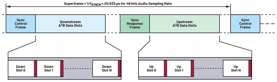 A2B適合專業音訊系統、家庭錄音室和現場舞臺設施,利用CAT5或XLR等現有電纜技術就能輕鬆實現音訊連接。接下來更深入瞭解A2B匯流排,以及其如何能夠雙向處理如此多的音訊通道。A2B匯流排以48 kHz心跳的方式透過匯流排發送超幀。資料以1024倍的速率傳輸,匯流排上的資料流程頻率達到49.152 MHz。超幀由兩部分組成:一部分是上游,另一部分是下游,通訊由同步控制幀和同步回應幀啟動。在下游/上游時隙內插入所有I2S/TDM資料、I2C資料、GPIO和中斷資訊。
