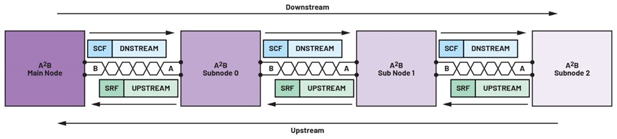 A2B是一種高速雙向時間同步匯流排,可傳輸I2S/TDM以及I2C、SPI、GPIO資料,資料速率為50 Mbps。此種高速資料傳輸的優勢是任意兩個節點之間的延遲低至50 μs。
