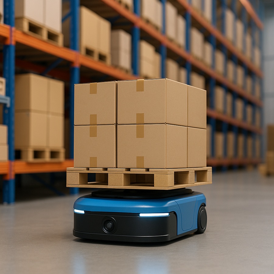 圖一 : 自動搬運車(AMR)在倉庫內搬運貨物,展現自動化降低人力依賴。