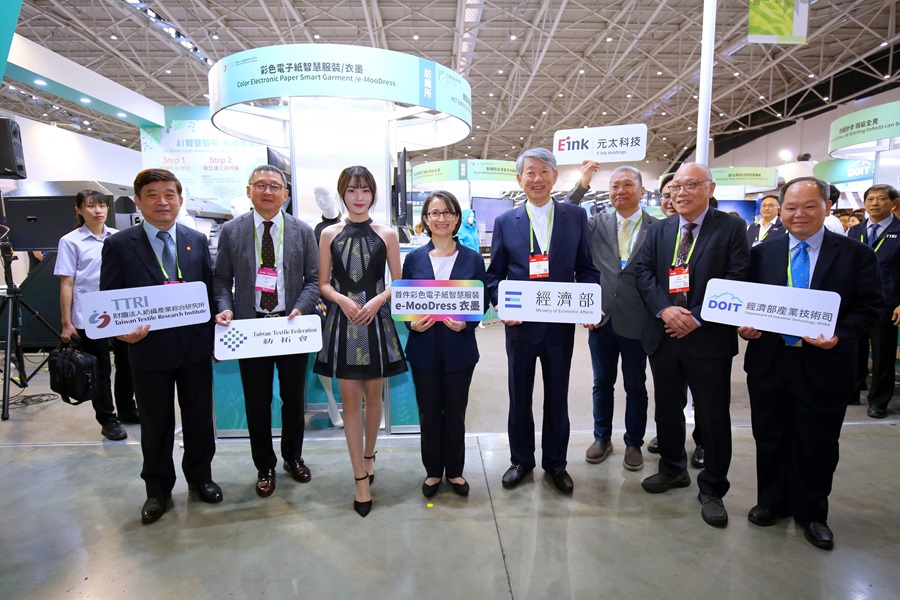 圖三 : 圖左起為紡織綜合所所長李貴琪、紡拓會董事長郭紹儀、穿著彩色電子紙智慧服飾e-MooDress的模特兒、副總統蕭美琴、經濟部部長郭智輝、元太科技協理陳俊賢、產紡協會理事長黃鯤雄、經濟部產業技術司副司長周崇斌。(source:紡織綜合所)