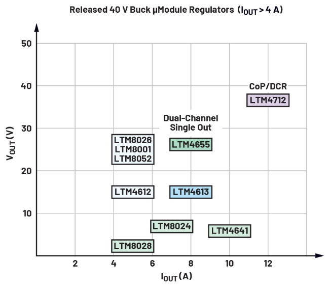 ADI推出多款40 V降壓型μModule穩(wěn)壓器。圖一為重點展示最大負載電流在 4 A以上的幾款現(xiàn)有穩(wěn)壓器,但這些降壓型穩(wěn)壓器支援的電壓和電流範圍有限。採用四開關降壓-升壓型μModule穩(wěn)壓器LTM4712作為降壓轉換器,可以顯著拓展工作範圍,進而簡化客戶的系統(tǒng)設計。