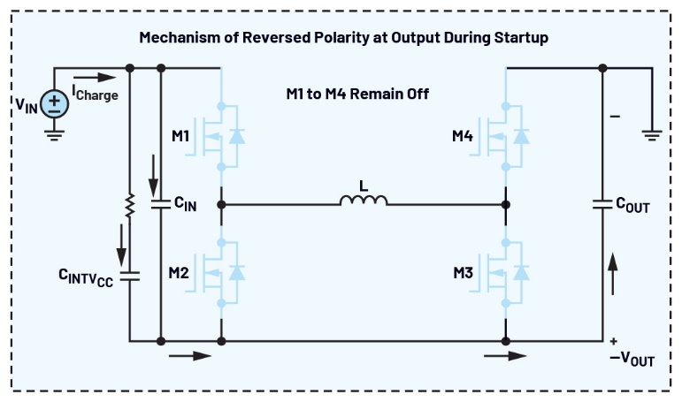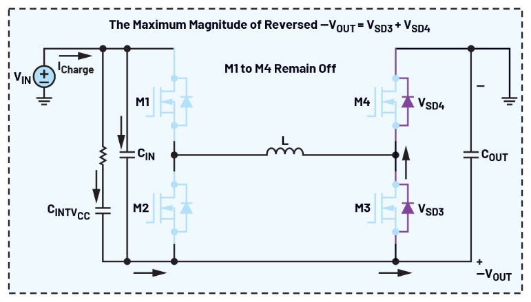 圖十展示啟動期間輸出電壓反向的原理。在輸入電源接通後,但在所有四個MOSFET開始切換之前,輸入電流開始透過兩條路徑反向?qū)敵鲭娙莩潆姡浩湟皇峭高^跨接在M1和M2上的CIN去耦電容,其二是透過INTVCC電容路徑。如果CIN或CINTVcc明顯大於COUT,則可能出現(xiàn)更高的反向輸出電壓。