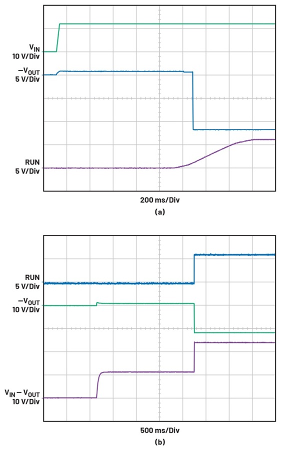 | 圖十二 : 啟動期間的反向-VOUT波形:(a)與COUT (330 μF)相比,CIN (50 μF)相對較小;(b)與COUT (330 μF)相比,CIN (350 μF)相對較大。 |