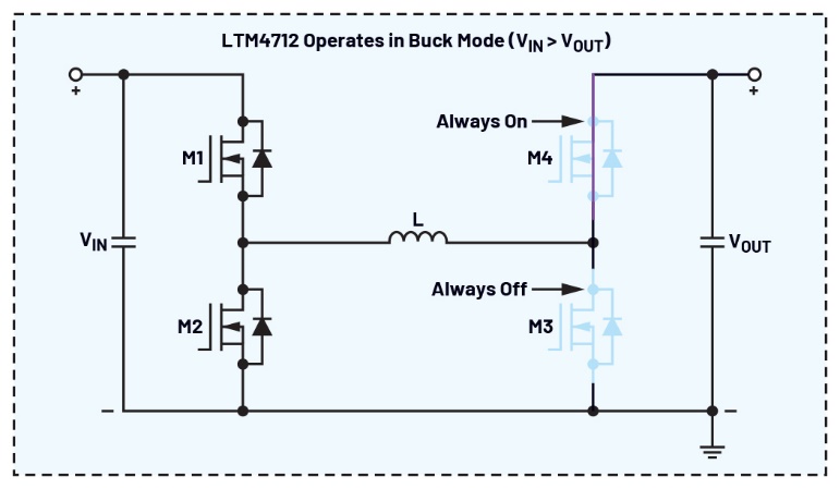 該款四開關降壓-升壓轉換器可以輕鬆配置為降壓轉換器,無需任何特殊調(diào)整。當VIN > VOUT時,內(nèi)部控制器會讓功率FET M3保持關斷,而M4保持導通。M1和M2會調(diào)節(jié)輸出,就像標準降壓轉換器一樣運行,如圖二所示。