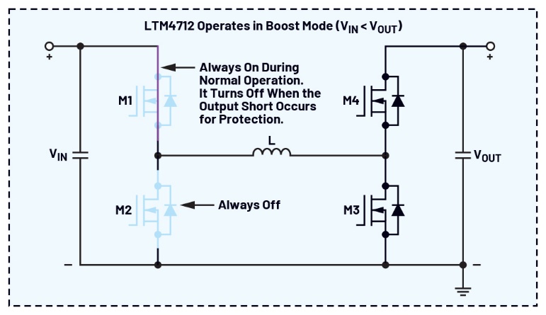 在VIN < VOUT的應用中使用該款四開關降壓-升壓轉換器時,內(nèi)部開關M1保持導通,而M2保持關斷。M3和M4會自然地調(diào)節(jié)輸出,就像典型升壓轉換器一樣,如圖五所示。