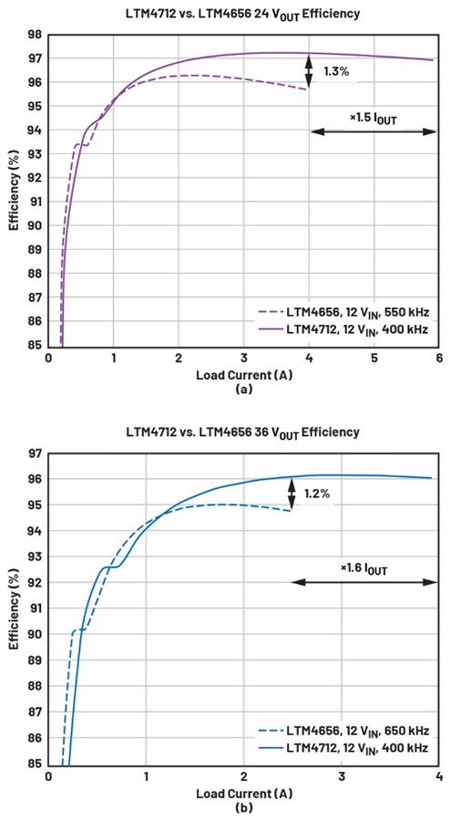 相較於之前的降壓穩(wěn)壓器LTM4613,儘管M4引入額外的傳導損耗,但新元件仍然實現(xiàn)更高的能效比,如圖三所示。這一改進是MOSFET和電感技術進步的結果。