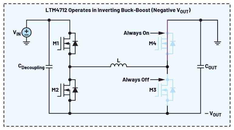 與標準降壓轉換器類似,該款四開關降壓-升壓轉換器也可配置為反相降壓-升壓拓撲,以用於負輸出應用。如圖七所示,M1和M2以互補方式切換;在此操作期間,M3關斷,M4導通。請注意,最大電壓VMAX = |VIN|+|VOUT|必須小於40 V,即該元件的最大額定電壓。流過電感的直流電流IL的幅度計算公式為IL = IOUT/(1-D),其中D是包含M1和M2的相位臂的工作週期,M1是主開關。