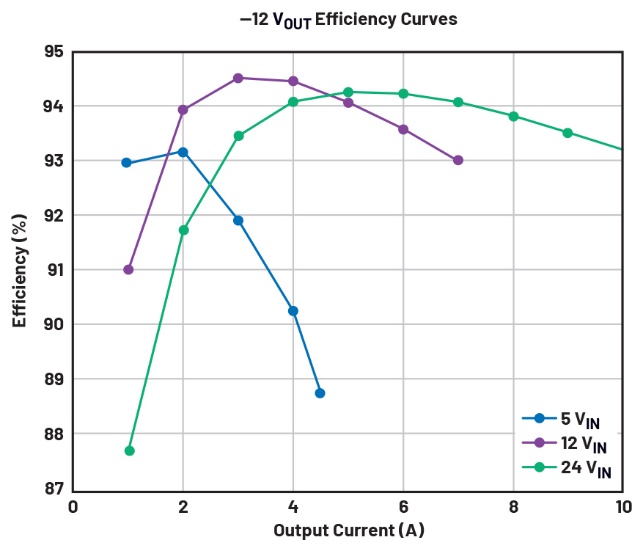 圖八為反相配置的電路示例,該電路設計為24 V輸入和-12 V輸出,支援高達10 A的負載電流。圖九顯示從基準平臺測試獲得的效率曲線。
