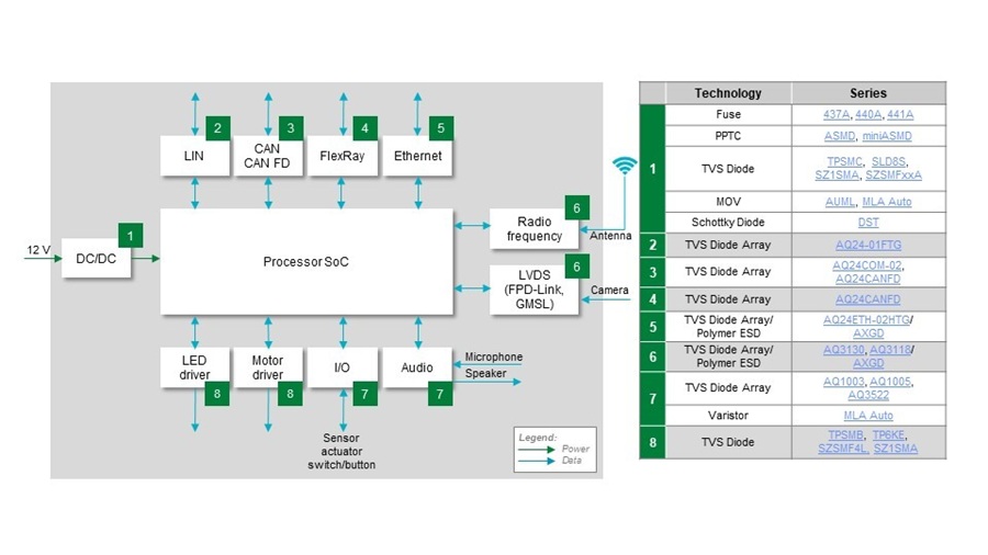 確保ZCU中的眾多通訊和控制介面不會在惡劣的汽車使用環境中受到損壞,對於車輛的安全運行至關重要。靜電放電和瞬態電壓是主要的危害能量源。ESD二極體和聚合物ESD抑制器可為通訊資料線和控制線提供適當的保護。選擇低電容元件以減少訊號失真,使用靜電放電保護解決方案,可確保在分區控制架構內的ZCU及其連接功能之間進行可靠的資料傳輸。