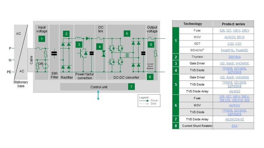 車用電池充電機(圖三)將交流電線電壓轉換為直流電壓,為電池組充電,工作電壓為 400-800V。隨著更快、更高功率的充電(包括三相電源)成為標準配置,每個電路模組都需要保護元件,有些還需要控制元件以提高效率。
