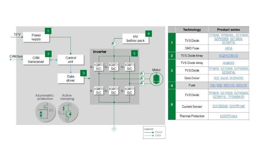 與 ZCU 電路中的電源一樣,牽引逆變器電路中的電源也需要過流和瞬態電壓保護。保險絲和 TVS 二極體可提供必要的保護。