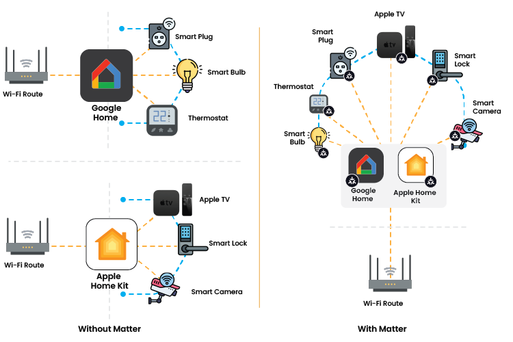 此外,家庭自動控制器通常是手機App或智慧喇叭內建的語音助理,如Google Assistant、Amazon Alexa等,因為各自一個陣營相關控制也無法互通。上述種種門戶之見給製造商、消費者帶來了數年的困擾後大廠終於達成共識,決議用Matter協定進行統一,往後只要發展一套製造商與消費者均可暢行無阻。