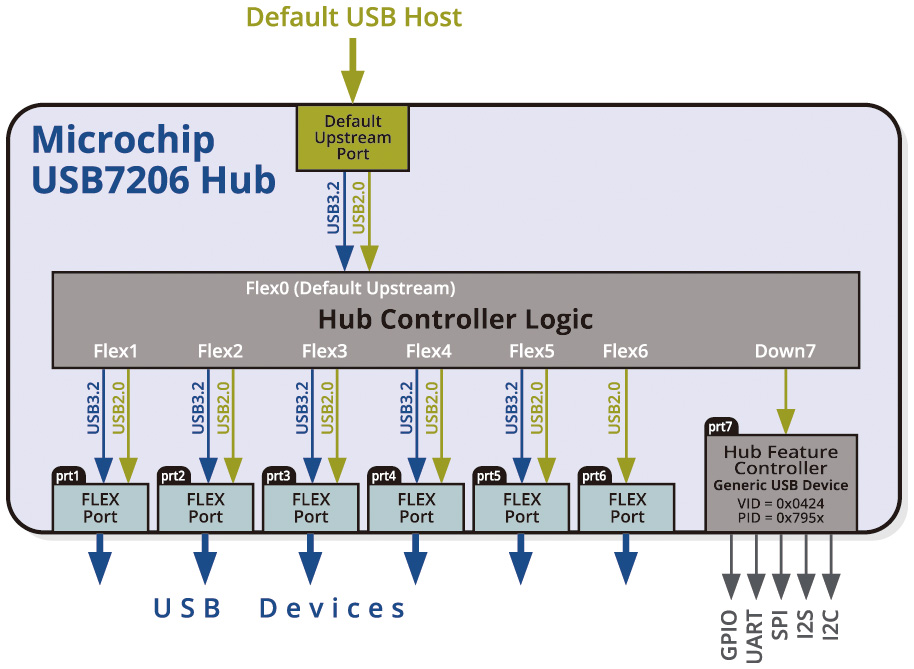 Microchip智慧型集線器內建一個USB裝置,稱為「集線器功能控制器(HFC)」,可用於啟動FlexConnect功能。此「集線器功能控制器(HFC)」是一個通用WinUSB設備,永久連接到集線器的最後一個USB端口。
