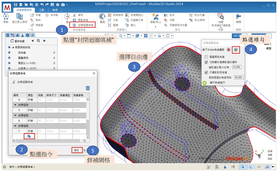 在修復表面網格的頁籤,如圖五標示的順序,建立填補網格:
