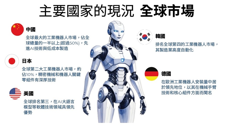 中國已是全球最大、發展最快的機器人市場,全球超過一半的工業機器人部署於此。其競爭優勢首先是「規模」,龐大的國內市場為新技術提供了絕佳的試驗場;其次是「低成本」,強大的製造能力與政府補貼,使其能以極具破壞力的價格進入市場;最後是「AI技術」,其AI發展水平僅次於美國,為機器人的智慧化提供了堅實基礎。未來,臺灣的產品勢必會與中國的低成本、大規模輸出正面對決,過去在LED、太陽能等產業的經驗,足為警惕。