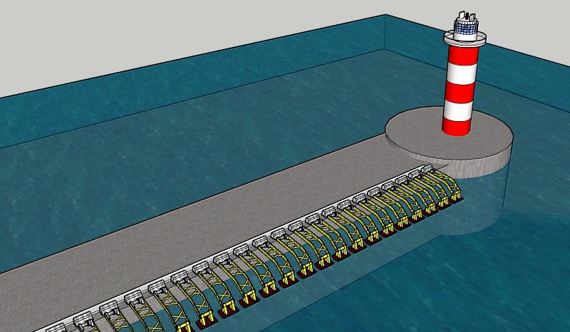 成大研發(fā)的「擎浪者」波浪發(fā)電機(jī),圖二為岸基式波浪發(fā)電機(jī)安裝在防波堤上的預(yù)想圖。