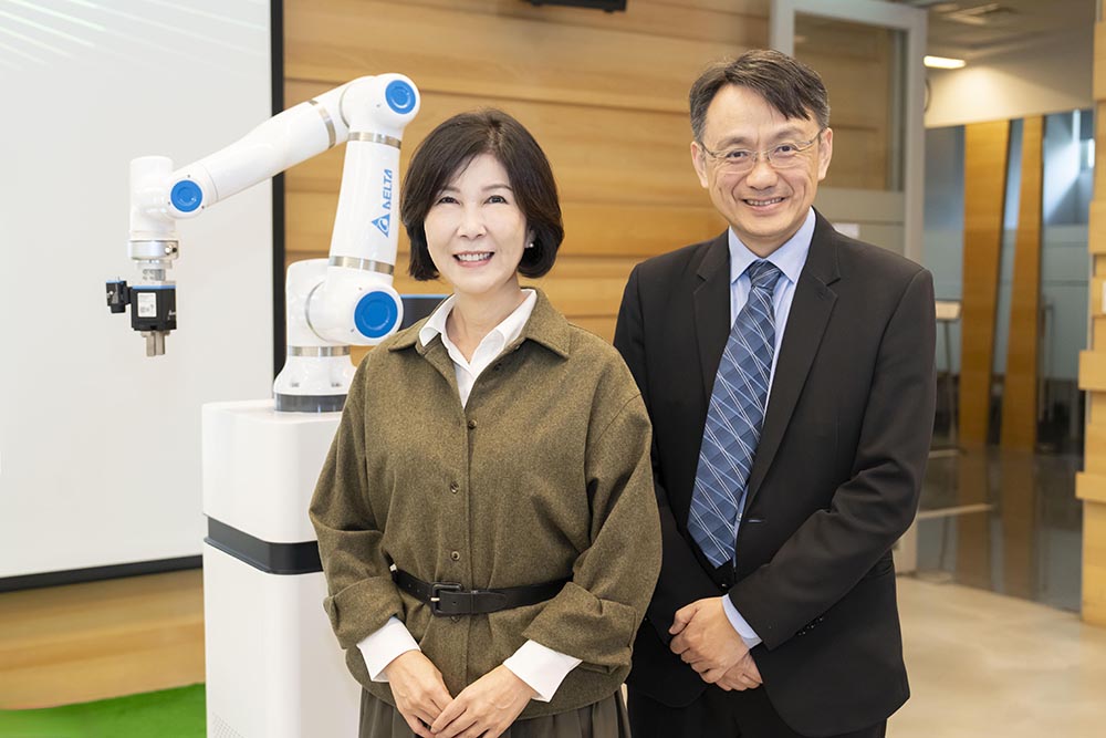 | 臺達基金會副董事長郭珊珊(左一)、臺達基金會執行長張楊乾(左二)分享臺達協作型機器手臂助力珊瑚復育。 |