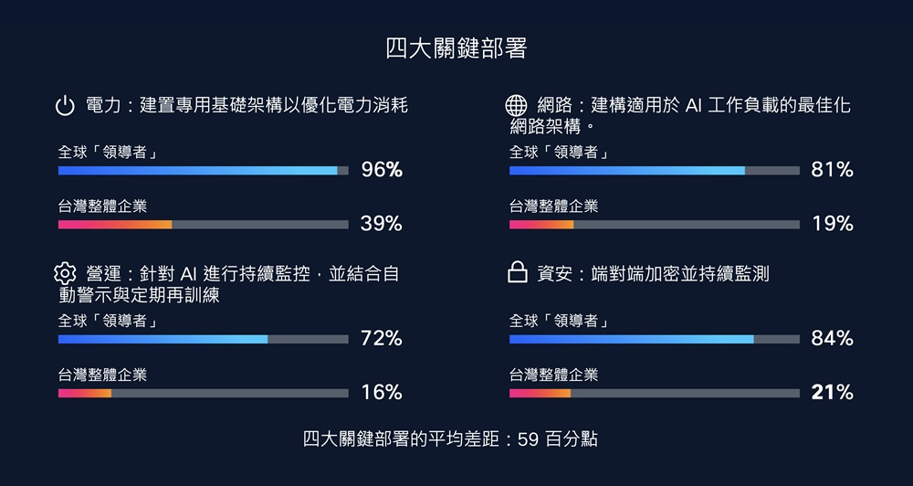 一是「未雨綢繆,提前化解電力瓶頸」。全球96%的AI領導者已建置專用架構以優化電力消耗,而臺灣僅39%企業具備同等能力,顯示AI運算擴張與電力基礎建設脫節的風險正在浮現。